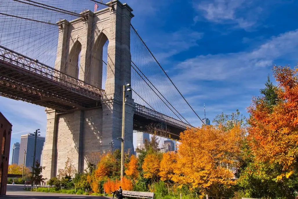 Khi mặt trời buông xuống, ánh sáng vàng cam trải dài trên Cầu Brooklyn, phản chiếu xuống mặt nước lấp lánh – một khung cảnh vừa thơ mộng vừa hùng vĩ. Đây là điểm đến lý tưởng để các cặp đôi dạo bước, lưu lại những khoảnh khắc tình yêu giữa sắc thu New York.