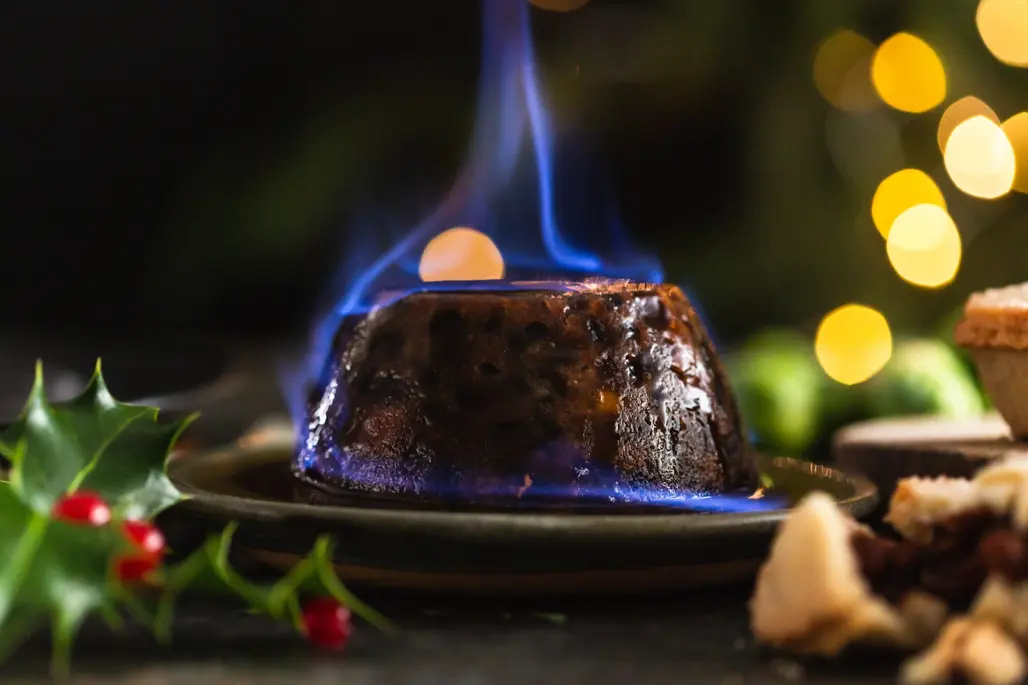 Một trong những món đặc sản Anh không thể thiếu trong mùa lễ hội chính là Christmas pudding. Loại bánh này thường được làm từ hỗn hợp trái cây khô, các loại hạt, thảo mộc, rượu mạnh như brandy, sau đó đem hấp cách thủy trong nhiều giờ. Khi chế biến xong, Christmas pudding có màu nâu sẫm, kết cấu đặc quánh nhưng mềm mại, đậm đà hương vị trái cây và gia vị.