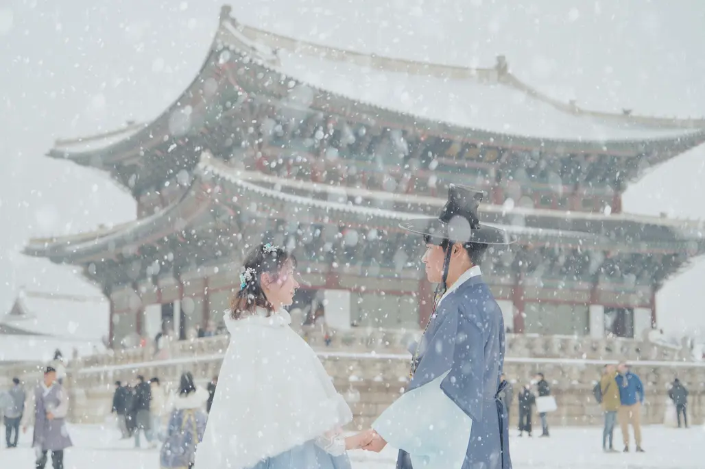 Một trải nghiệm không thể thiếu là khoác lên mình bộ Hanbok truyền thống. Trong tiết trời se lạnh, sắc màu rực rỡ của trang phục nổi bật giữa nền tuyết trắng và kiến trúc cổ, tạo nên bức tranh vừa hoài niệm vừa lãng mạn.