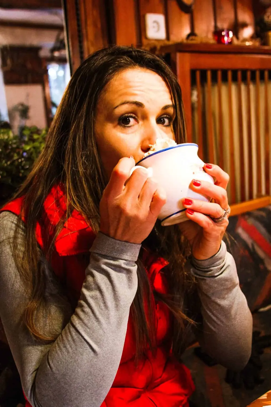 Sau khi dạo chơi ngoài trời, còn gì tuyệt hơn khi ngồi trong một quán nhỏ ấm áp, thưởng thức món goulash nóng hổi, bánh ngọt Áo hay ly vang nóng thơm nồng. Không gian gỗ mộc mạc, ánh nến vàng và tiếng nhạc du dương khiến bữa ăn trở nên trọn vẹn hơn bao giờ hết – đúng chất “hương vị mùa đông châu Âu”.