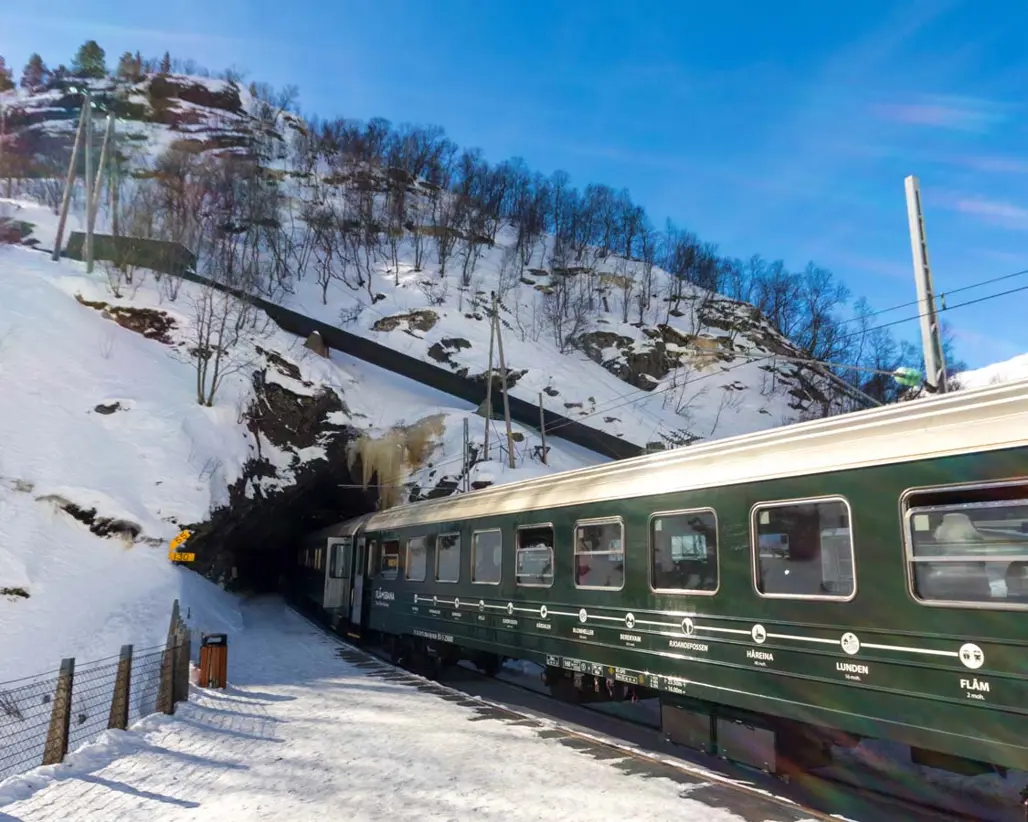 Không thể nói đến làng Flam Na Uy mà không nhắc đến trải nghiệm đi tàu hỏa Flam Railway – một trong những tuyến đường sắt đẹp nhất thế giới. Đó là hành trình di chuyển giữa hai thành phố Bergen và Oslo qua những cảnh quan núi non tuyệt đẹp, dẫn du khách qua những ngọn đồi phủ tuyết trắng, những thác nước đổ ào ào và những ngôi nhà nhỏ xíu nằm giữa thiên nhiên hoang sơ. Điểm đặc biệt của tuyến tàu này chính là sự hòa quyện giữa kỹ thuật xây dựng hiện đại cùng vẻ đẹp tự nhiên tột đỉnh, khiến cho bất cứ ai cũng có cảm giác như đang lạc vào một thế giới cổ tích.