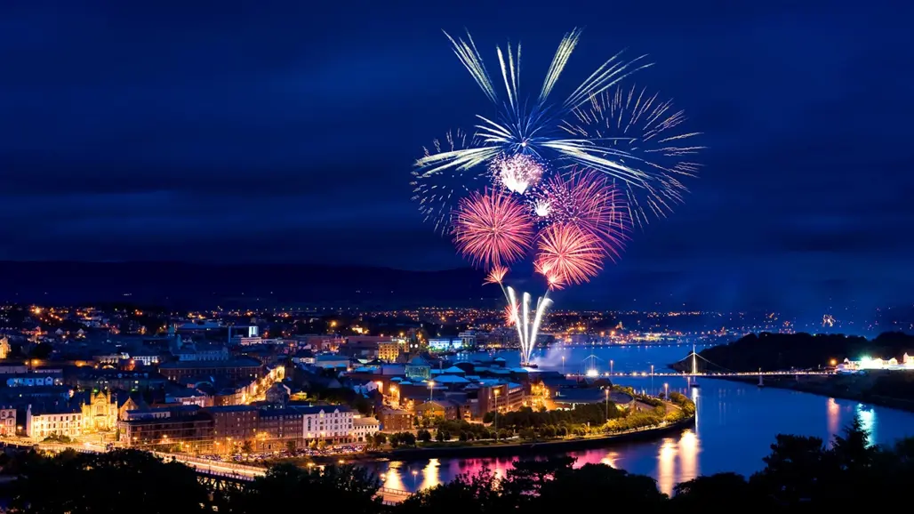 Pháo hoa là phần không thể thiếu trong lễ hội Halloween Derry, thể hiện sự phấn khích và hoàng tráng của ngày lễ này. Đúng thời điểm đêm hội bắt đầu đến phút cuối, các màn trình diễn pháo hoa rực rỡ được tổ chức trên dòng sông Foyle - nơi tạo nên khung cảnh huyền ảo, lung linh, một cảnh tượng khiến mọi du khách tò mò và thích thú. Đặc biệt, vào thời điểm này, không khí tại Derry trở nên rộn ràng, tràn ngập niềm vui, góp phần làm tăng giá trị du lịch Bắc Ireland mùa thu – một mùa lễ hội đặc sắc không thể bỏ qua trong hành trình khám phá Halloween Châu Âu.