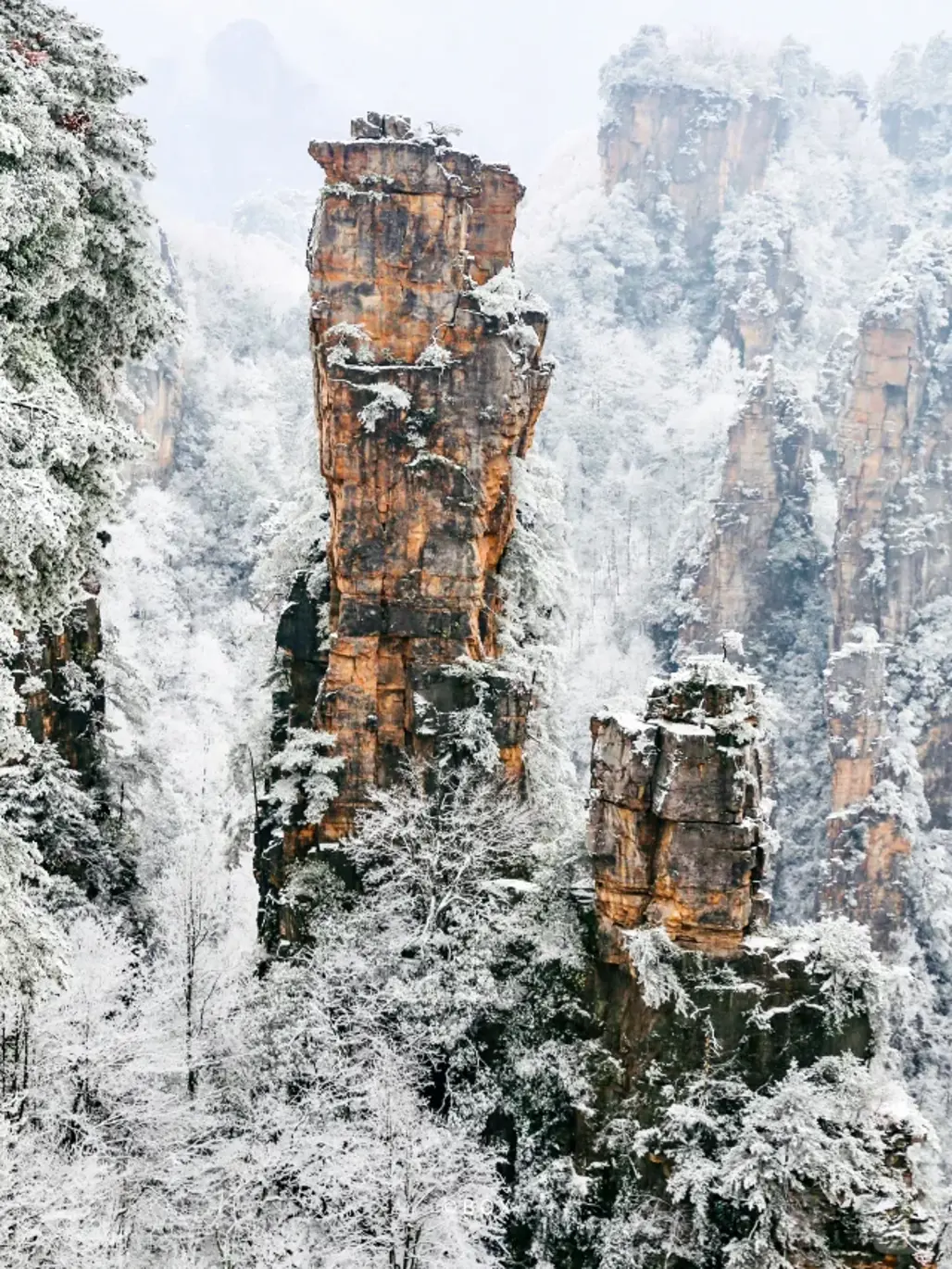 Mùa đông tại Trương Gia Giới mang một vẻ đẹp đặc biệt, với tuyết phủ trắng xóa khắp các đỉnh núi, thung lũng, và cả các con đường nhỏ quanh làng mạc. Đây là thời điểm hiếm hoi của Trung Quốc có cảnh tuyết rơi dày, mang lại cảm giác thơ mộng, như trong các bộ phim lãng mạn cổ trang. Khác xa với những vùng có khí hậu ôn đới, mùa đông ở Trương Gia Giới vẫn giữ được nét hoang sơ, yên bình, tạo cảm giác thư thái, dễ chịu.
