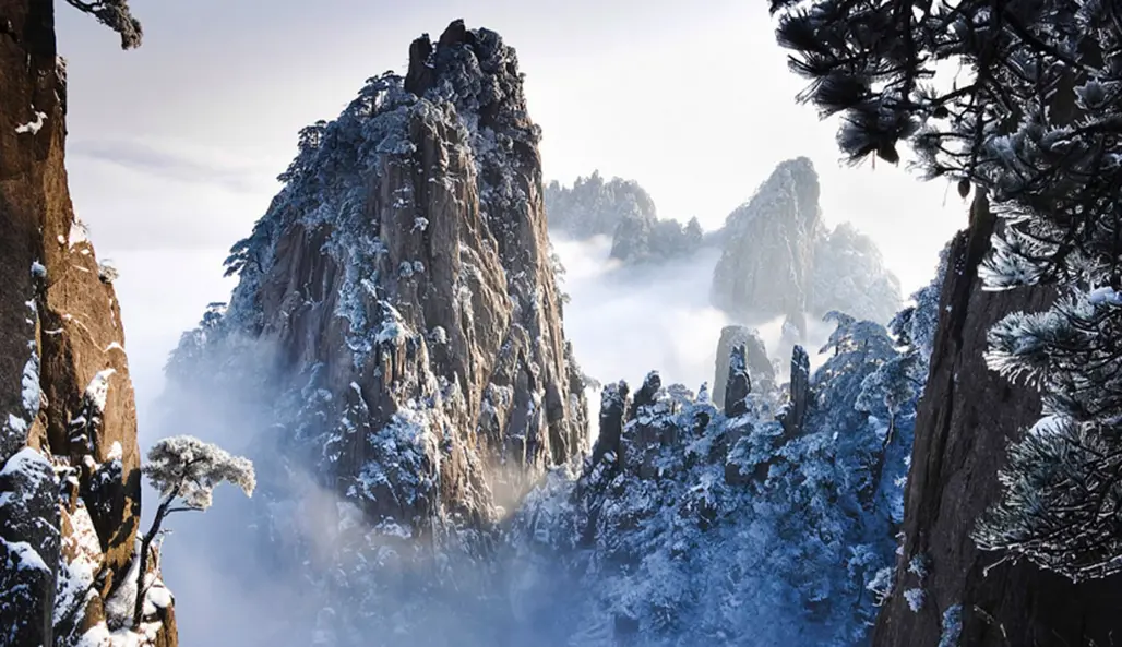 Mùa đông, cảnh đẹp Hoàng Sơn có phần lộng lẫy, huyền bí hơn bao giờ hết. Những ngọn núi phủ đầy tuyết trắng muốt, tất cả đều present một không gian huyền ảo, như trong phim cổ tích Trung Hoa. Không chỉ trời trong và mây mù, nhiệt độ xuống thấp còn tạo ra các hiện tượng băng giá độc đáo, biến Hoàng Sơn thành một bức tranh mùa đông rõ nét, thần tiên.