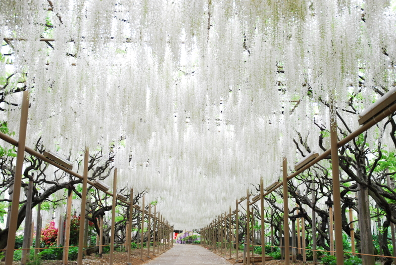 Trong số các điểm chụp hình tuyệt đẹp tại Ashikaga Flower Park, đường hầm hoa trắng là một trong những biểu tượng nổi bật. Dài hàng chục mét, đường hầm này được trang trí bằng hàng nghìn đóa hoa trắng tinh khôi, tạo thành câu chuyện cổ tích giữa đời thường. Khi bước qua đó, du khách như đang đi qua một cung điện trong mơ, cảm giác nhẹ nhàng, dễ chịu lan tỏa khắp mọi giác quan.