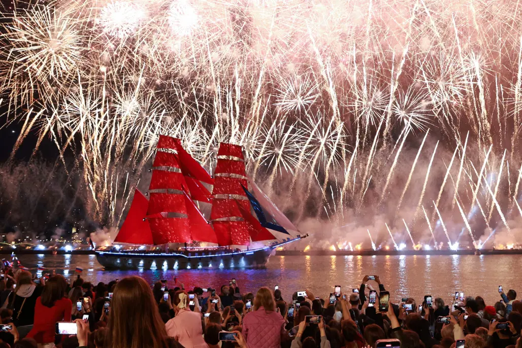 Cao trào của lễ hội Cánh Buồm Đỏ Thắm là màn trình diễn trên sông Neva với con tàu mang cánh buồm đỏ xuất hiện giữa ánh sáng, âm thanh và hiệu ứng sân khấu quy mô lớn. Nhiều nguồn mô tả đây là một trong những show pháo hoa và biểu diễn trên mặt nước ấn tượng nhất mùa hè nước Nga. Với du khách quốc tế, phần pháo hoa Saint Petersburg trong đêm Scarlet Sails chính là khoảnh khắc đắt giá nhất để lưu giữ bằng ảnh và video.