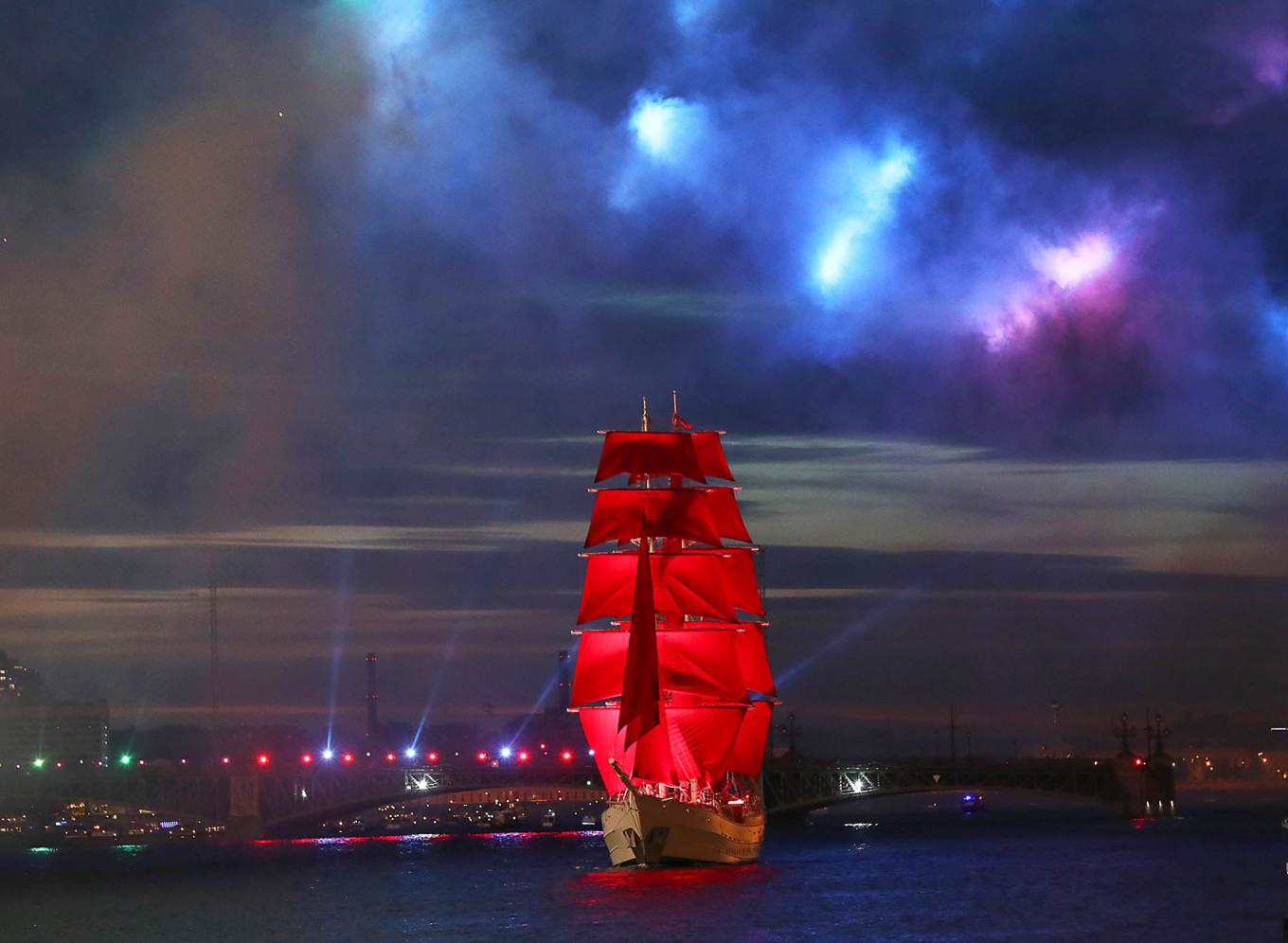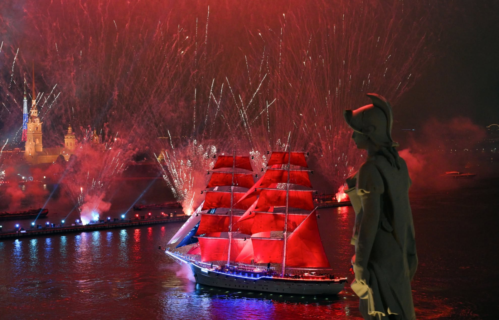 Điểm nhấn nổi tiếng nhất của lễ hội chính là màn xuất hiện của con tàu mang cánh buồm đỏ trên sông Neva. Đây là phần được chờ đợi nhất trong đêm, tạo nên cảm giác như một cảnh phim bước ra đời thực. Khi tàu tiến vào không gian trung tâm thành phố, kết hợp cùng ánh sáng sân khấu, pháo hoa và nền trời mùa Bạch Dạ, toàn bộ khung cảnh mang lại cảm giác rất điện ảnh và khó quên.