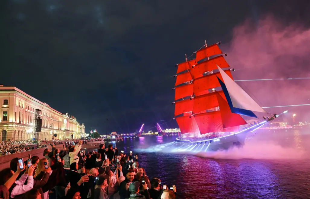 Khi nhắc đến trải nghiệm lễ hội Scarlet Sails, nhiều người sẽ nghĩ ngay đến khoảnh khắc con tàu với cánh buồm đỏ thắm lướt qua mặt nước trong ánh sáng rực rỡ của đêm Saint Petersburg. Nhưng sức hút của sự kiện này không chỉ nằm ở một hình ảnh biểu tượng, mà còn đến từ toàn bộ không khí lễ hội được dàn dựng công phu: sân khấu âm nhạc lớn, hiệu ứng ánh sáng trên nền kiến trúc cổ kính, màn pháo hoa hoành tráng và cảm giác náo nhiệt của một thành phố gần như không ngủ trong mùa hè.