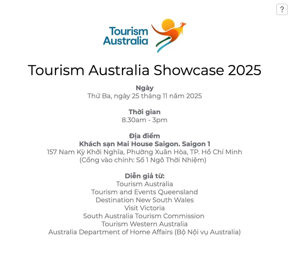 Ngày 25/11/2025, Du Lịch Triều Hảo vinh dự được Tổng Cục Du Lịch Úc (Tourism Australia) mời tham dự Tourism Australia Showcase 2025 tại TP. Hồ Chí Minh.