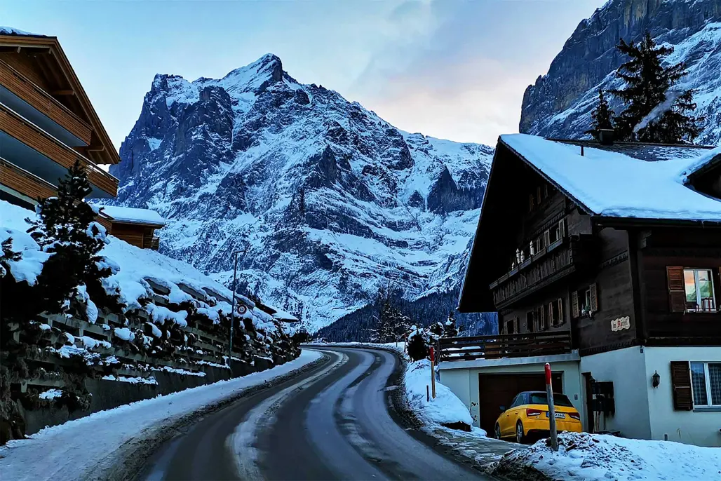 Khi nghĩ về con đường phủ tuyết Châu Âu đẹp, không thể không nhắc đến Grindelwald – một làng nhỏ nằm dưới chân đỉnh Eiger hùng vĩ trong dãy Alps. Con đường này như một tấm thảm lớn trải dài, phủ kín trắng muốt, mang đến cảm giác như đang lạc vào một bức tranh sơn dầu khổng lồ của tự nhiên.
