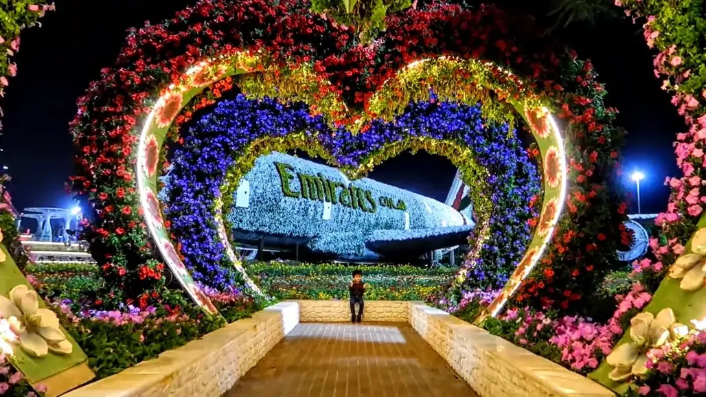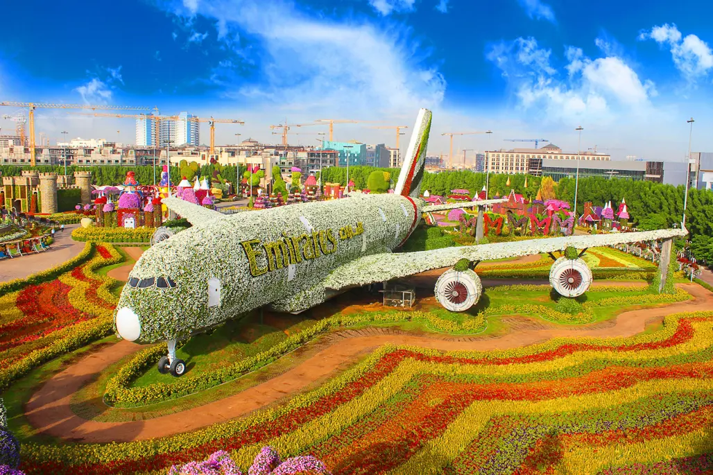 Một trong những điểm nhấn nổi bật chính là máy bay hoa Emirates A380 – chiếc máy bay lớn nhất thế giới được phủ đầy hoa, tượng trưng cho sự đẳng cấp của hàng không Dubai. Công trình này không chỉ gây ấn tượng bởi kích thước khổng lồ mà còn bởi chi tiết hàng trăm nghìn đóa hoa được gắn kết khéo léo nhằm tạo hình dáng của chiếc Boeing A380. Đặc biệt, công trình này đã chính thức ghi vào sách kỷ lục Guinness thế giới, trở thành biểu tượng của sáng tạo và tinh thần vươn xa của đất nước Dubai.