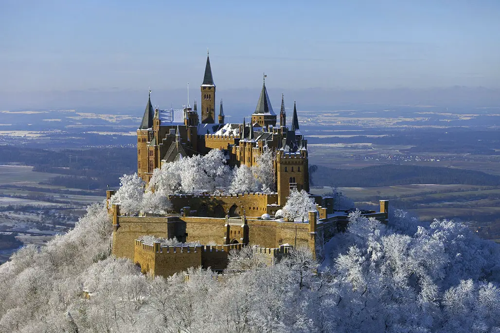 Tọa lạc trên đỉnh đồi cao trong khu vực Baden-Württemberg, lâu đài Hohenzollern là minh chứng cho sức mạnh và quyền uy của gia đình hoàng gia Đức. Trong mùa đông, nơi đây trở nên huyền bí hơn bao giờ hết, khi tuyết trắng bao phủ quanh các tường thành, tạo nên cảnh sắc hoàng gia đầy thần thoại. Phong cảnh từ đỉnh đồi, bao phủ bởi lớp tuyết, phóng tầm mắt ra xa, mang lại cảm giác như chinh phục được cả thế giới.