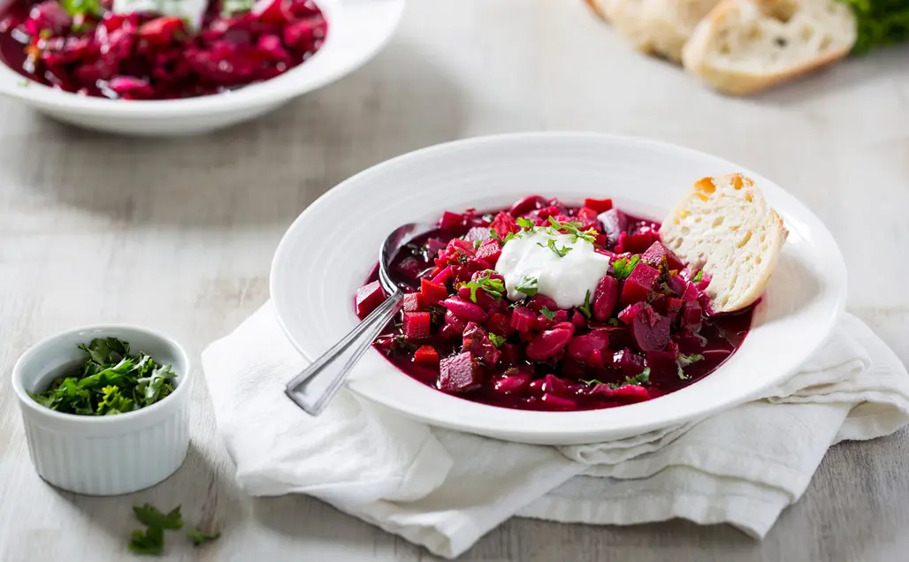 Không thể trải nghiệm mùa đông Nga mà không thưởng thức các món ăn truyền thống ấm nóng, đậm đà. Súp củ cải đỏ (borscht) - món canh đặc trưng của ẩm thực Nga, mang vị ngọt tự nhiên của củ cải, thịt bò hoặc heo, ăn kèm với bánh mì đen là lựa chọn lý tưởng để giữ ấm cơ thể.