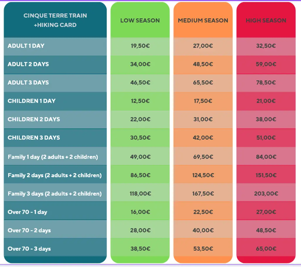Giá vé tàu Cinque Terre dao động tùy theo loại vé và thời điểm mua, trung bình từ 4-10 EUR cho chuyến đi nội bộ trong ngày. Vé dài hạn hoặc trả trước nhiều ngày còn có các mức ưu đãi đặc biệt, phù hợp với các nhóm đoàn hoặc gia đình.