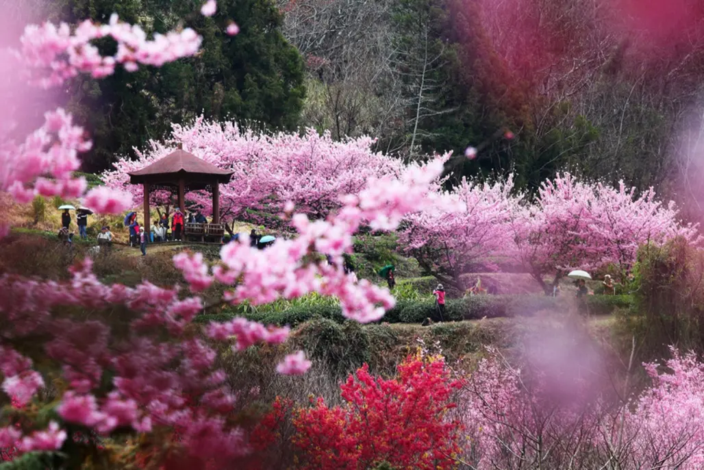 Một trong những điểm hút khách nhất của du lịch Đài Loan vào mùa xuân chính là mùa hoa anh đào. Các tỉnh như Nantou, Alishan, hoặc Taroko Gorge đều ngập tràn cảnh sắc thơ mộng với sắc hồng của hoa anh đào nở rộ. Thời điểm lý tưởng để tham quan là từ tháng 3 đến giữa tháng 4, khi mà những cây hoa đồng loạt bung nở, tạo thành tấm thảm màu hồng xen lẫn với không gian núi rừng xanh mướt.