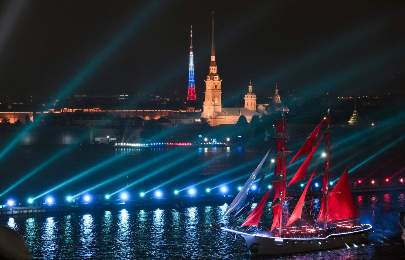Điểm nhấn nổi tiếng nhất của lễ hội chính là màn xuất hiện của con tàu mang cánh buồm đỏ trên sông Neva. Đây là phần được chờ đợi nhất trong đêm, tạo nên cảm giác như một cảnh phim bước ra đời thực. Khi tàu tiến vào không gian trung tâm thành phố, kết hợp cùng ánh sáng sân khấu, pháo hoa và nền trời mùa Bạch Dạ, toàn bộ khung cảnh mang lại cảm giác rất điện ảnh và khó quên.