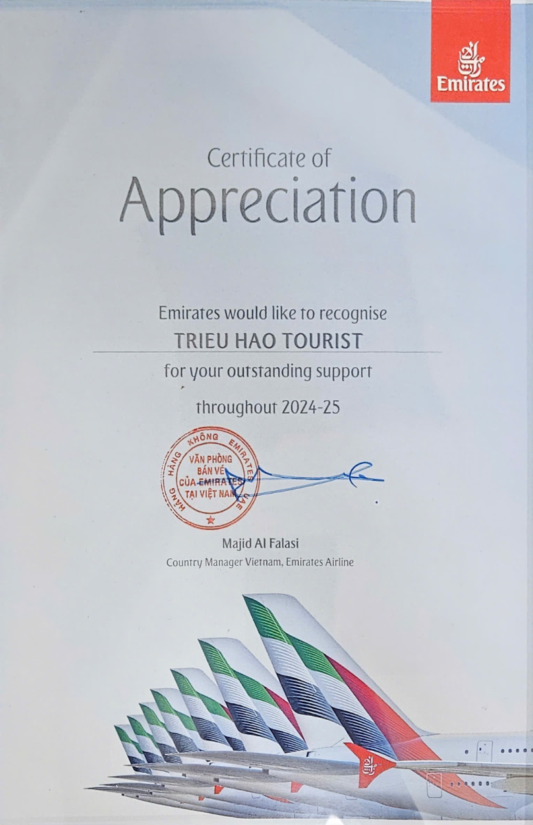 Việc được Emirates – một trong những hãng hàng không cao cấp nhất thế giới – vinh danh là minh chứng rõ ràng cho uy tín và chất lượng dịch vụ mà Du Lịch Triều Hảo đã xây dựng trong nhiều năm.