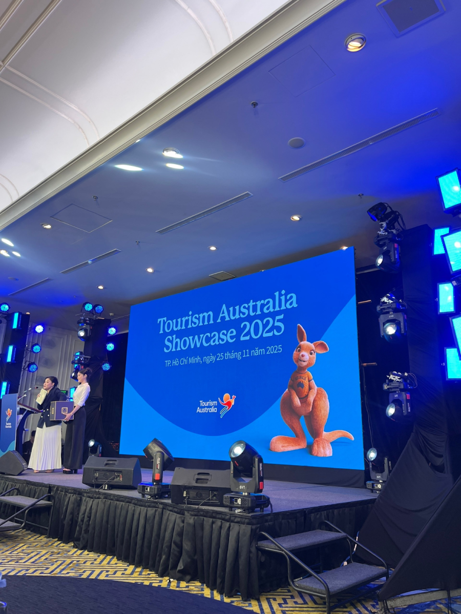 Sự kiện được tổ chức tại khách sạn Mai House Saigon với thiết kế sân khấu hiện đại, mang màu xanh đặc trưng của ngành du lịch Úc. Hình ảnh chú kangaroo – biểu tượng thân thiện của Tourism Australia – tạo điểm nhấn cho toàn bộ chương trình.