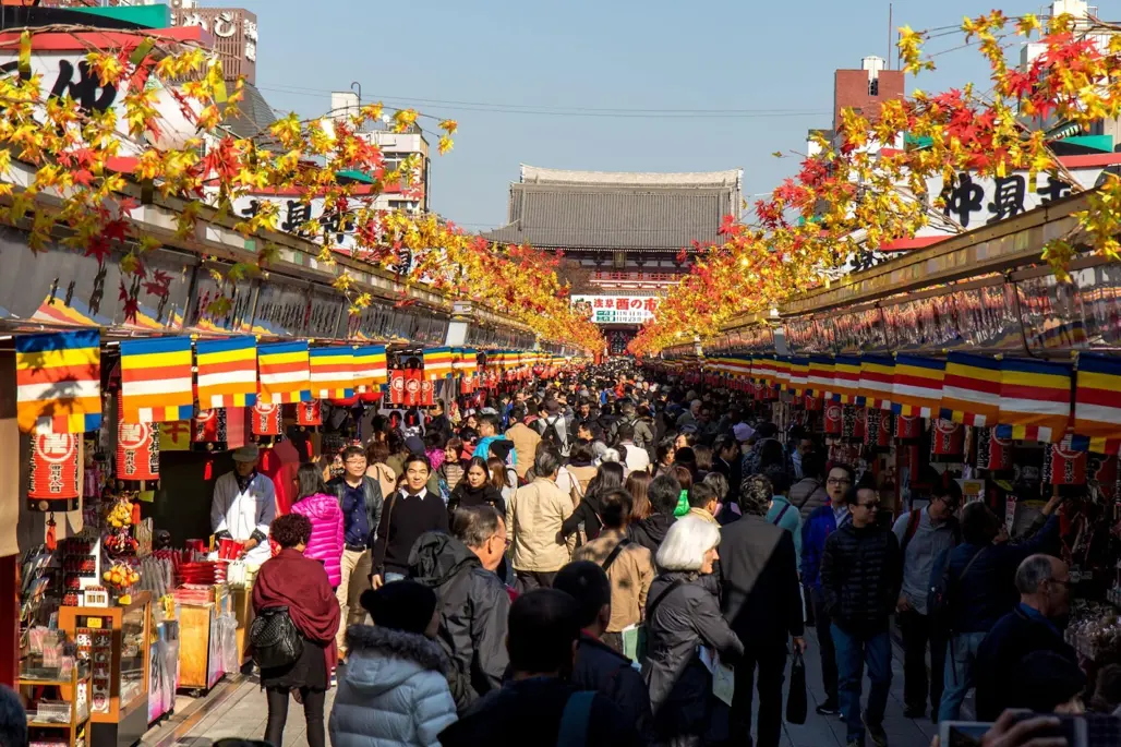 Khu phố Nakamise dẫn từ cổng Kaminarimon nổi tiếng dẫn vào chùa Senso-ji, là nơi diễn ra những hoạt động mua sắm, lễ hội đặc sắc mùa Tết. Những gian hàng rực rỡ bày bán các loại bánh kẹo truyền thống, đồ chơi, quà lưu niệm, thể hiện tinh thần văn hóa đậm đà của người Nhật trong ngày xuân. Đặc biệt, các lễ hội như múa rồng, múa lân, và các nghi thức cầu may đều diễn ra sôi động tạo nên không khí vui tươi, náo nhiệt mang đậm nét truyền thống của du lịch Nhật Bản Tết.